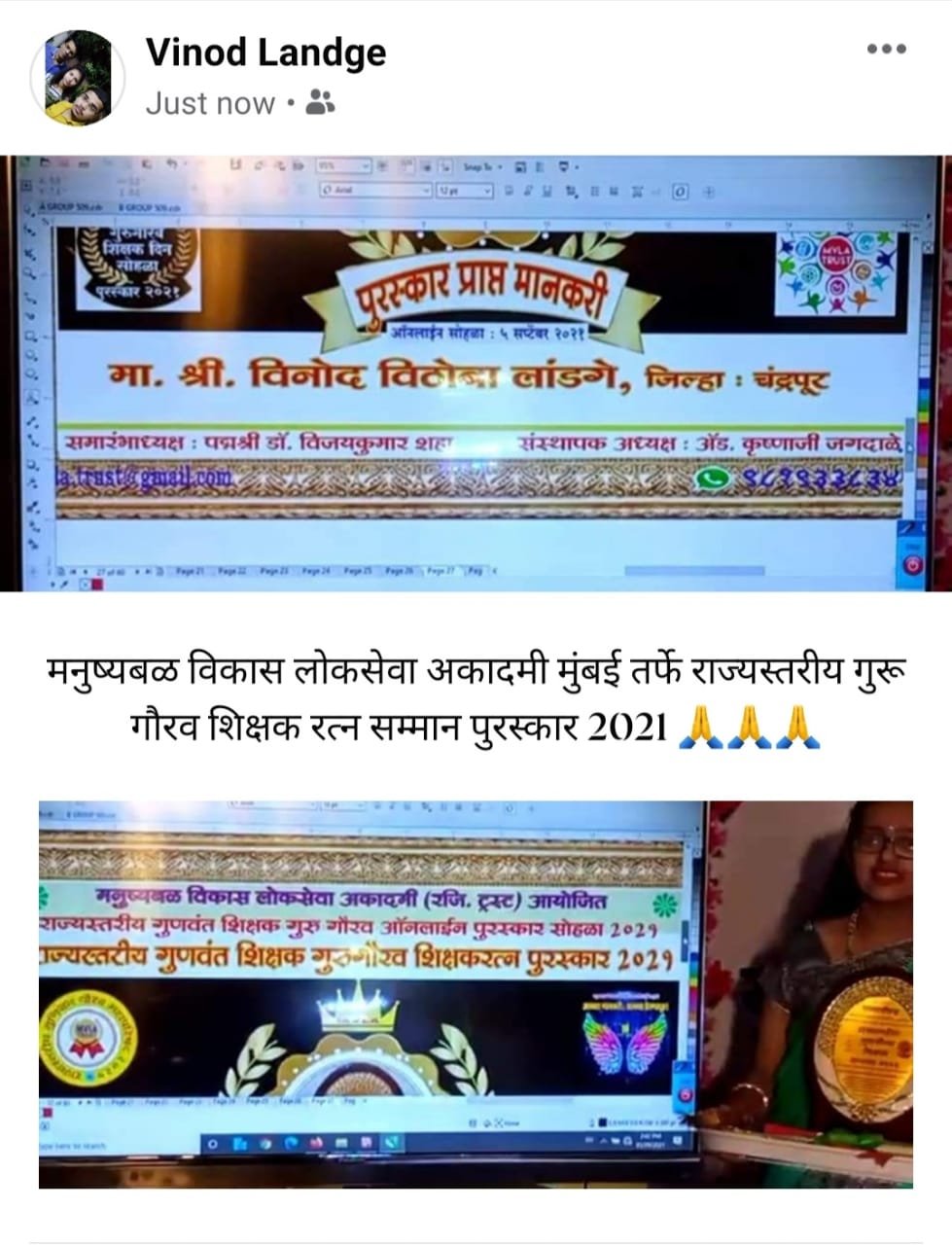 मनुष्यबळ विकास लोकसेवा अकादमी मुंबई तर्फे या वर्षीचा राज्यस्तरीय शिक्षक रत्न सन्मान पुरस्कार विनोद विठोबा लांडगे विषय शिक्षक जिल्हा परिषद उच्च प्राथमिक शाळा पेंढरी कोके तालुका शिंदेवाही जिल्हा चंद्रपूर यांना प्राप्त झालेला आहे. त्यांना हा पुरस्कार त्यांच्या उपक्रमाची दखल घेऊन प्राप्त झालेला आहे. लेखन, कला, विज्ञान वक्तृत्व , शिक्षकाने शाळेच्या उन्नतीसाठी समाजाकडून मिळवलेला लोकसहभागातून, प्राथमिक शाळा डोंगरगाव येथे सत्संग कॉन्व्हेंट निर्मिती (लोकसहभागातून) जिल्हा परिषद उच्च प्राथमिक शाळा डोंगरगाव येथे भव्य मैदान, सुंदर गार्डन *स्वच्छ शाळा सुंदर शाळा* 2013 ला शासनाकडून पुरस्कार व रोख रक्कम 50 हजार रुपये. पायाभूत चाचणीत वर्गाची उत्तम सरासरी , खो- खो खेळात जिल्हास्तरावर 5 दा प्रतिनिधित्व दुसऱ्या क्रमांकाचे पारितोषिक , नवोदय साठी करण मडावी यांची निवड ,शिक्षण हक्क कायद्यानुसार 10 घटकांची पूर्तता , ‘शाळा बंद शिक्षण सुरू’ हा उपक्रम,2021 मध्ये ‘ *झाडाखालची शाळा* हा उपक्रम सुरू त्यांच्या या विविध उपक्रमाची दखल घेऊन मनुष्यबळ विकास लोकसेवा अकादमी यावर्षी राज्यस्तरीय गुरुगौरव शिक्षक रत्न सन्मान पुरस्कार 5 sept जाहीर केलेला आहे. त्याबद्दल शाळा व्यवस्थापन समिती, शाळेतील मुख्याध्यापक त्यांचे सहकारी यांनी त्यांचे अभिनंदन केले आहे .