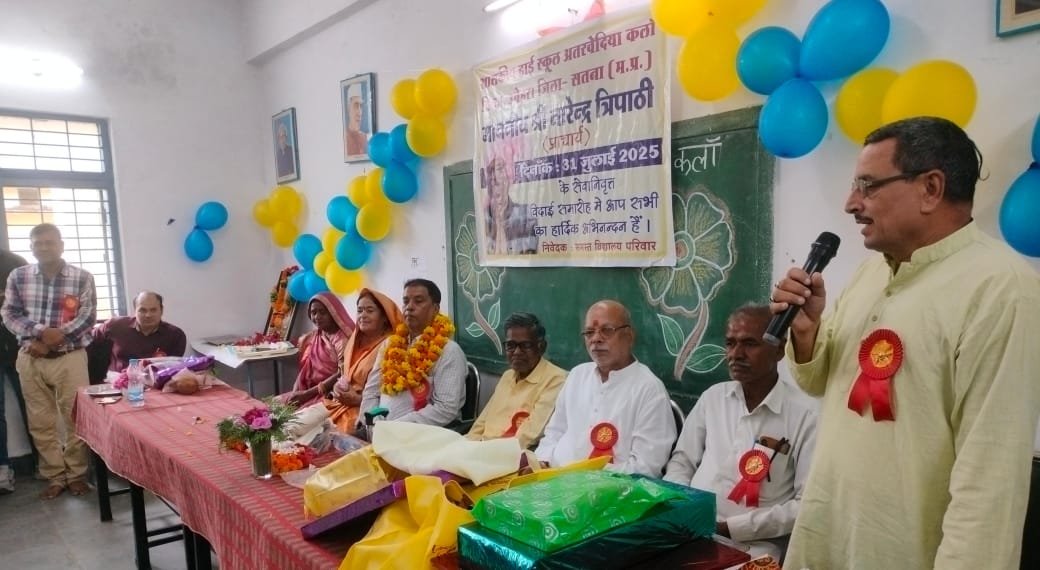 सतना। उचेहरा क्षेत्र के अतरवेदिया कला हाईस्कूल के प्राचार्य नरेन्द्र त्रिपाठी के सेवानिवृत्ति पर विदाई समारोह का आयोजन किया गया। सभी वक्ताओं ने कहा कि श्री त्रिपाठी का विद्यालय के बच्चों के विकास में योगदान सराहनीय रहा है व शिक्षा जगत में विशेष पहचान रही है। विभिन्न शिक्षकों द्वारा उन्हें शॉल एवं कलम देकर सम्मानित किया।