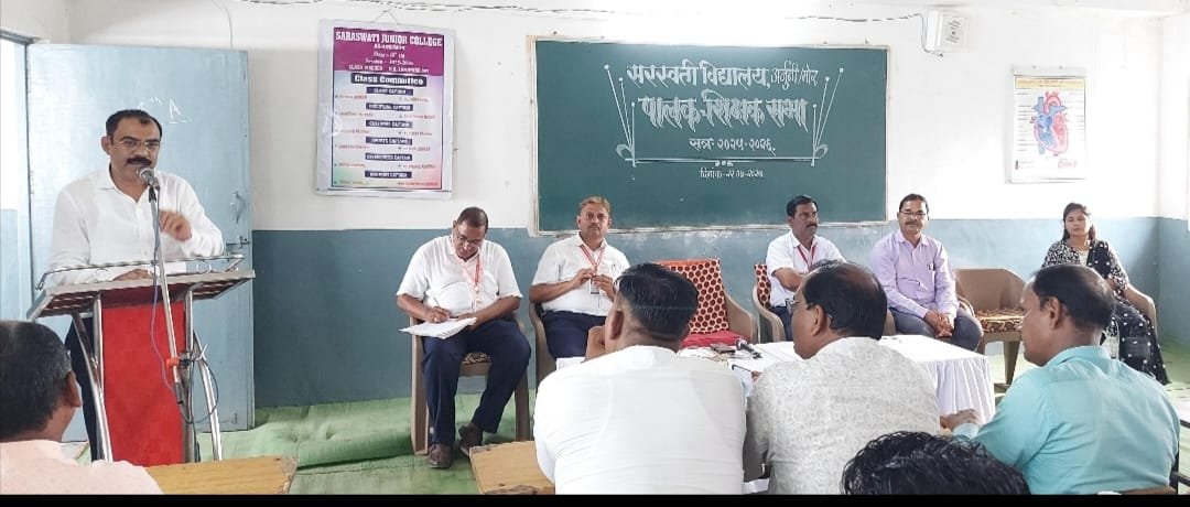 अर्जुनी मोर:- स्थानिक सरस्वती विद्यालयात वर्ग 5 ते 10 च्या पालक- शिक्षक संघ सभेचे आयोजन प्राचार्य जे.डी.पठान यांच्या अध्यक्षतेखाली करण्यात आले. सत्र 2025-26मधील या पहिल्या पालक शिक्षक सभेत विविध विषयांवर सविस्तर चर्चा करून ठराव घेण्यात आले.सर्वप्रथम सत्र 2024-25 मधील एस.एस.सी. व एच.एस.सी. परीक्षेच्या निकालाबाबत माहिती सांगून गुणवंत विद्यार्थ्यांचे कौतुक करण्यात आले. यानंतर सत्र 2025-26 करिता पालक-शिक्षक संघाची कार्यकारिणी स्थापन करण्यात आली. कार्यकारणीत विद्यालयाचे प्राचार्य हे पदसिद्ध अध्यक्ष असतात. उपाध्यक्ष म्हणून वर्ग 8 ते 10 साठी गजानन नाकाडे यांची निवड करण्यात आली.सचिव म्हणून कुंडलिक लोथे तर सहसचिव म्हणून वर्ग 5 ते 7 साठी स्मिता मेश्राम यांची निवड करण्यात आली.तसेच प्रत्येक वर्गातून एक पालक सदस्य व वर्गाचे वर्गशिक्षक यांची कार्यकारणी सदस्य म्हणून निवड करण्यात आली.
