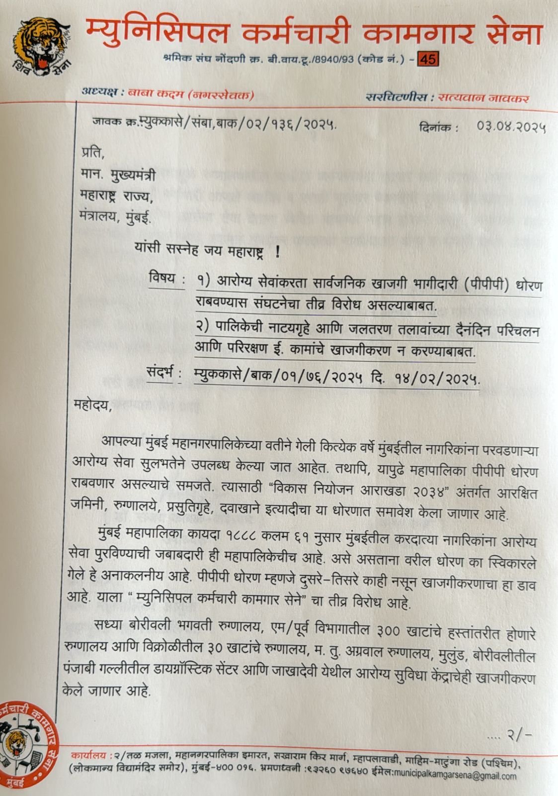 आरोग्य सेवांकरता सार्वजनिक खासगी भागीदारी (पीपीपी) धोरणास “म्युनिसिपल कर्मचारी कामगार सेनेचा तीव्र विरोध