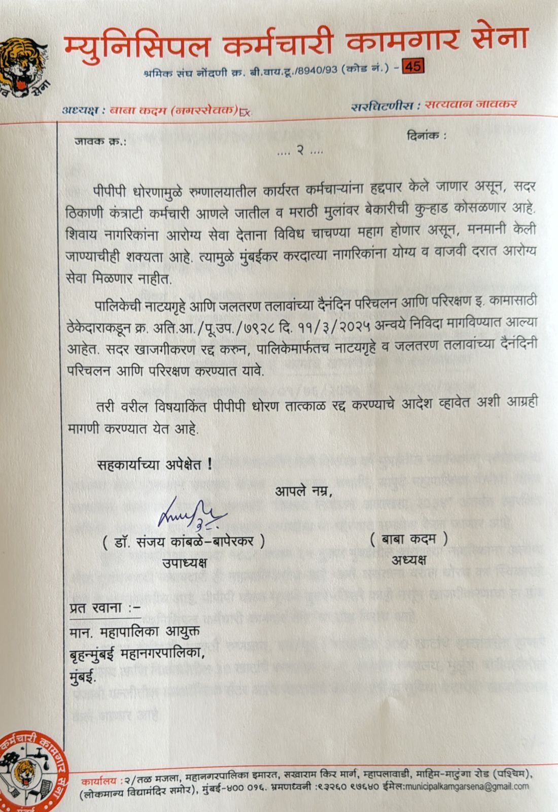 पालिकेची नाट्यगृहे आणि जलतरण तलावांच्या दैनंदिन परिचलन आणि परिरक्षण ई. साठी ठेकेदारांकडुन क्र.अति.आ.(पू.उ.)/७९२८/ दि.११/३/२०२५ अन्वये निविदा मागविण्यात आल्या आहेत.सदर खाजगीकरण रद्द करुन, पालिकेमार्फतच नाट्यगृहे आणि जलतरण तलावांच्या दैनंदिनी परिचालन आणि परिरक्षण करण्यात यावे अशीही मागणी करुन, पीपीपी धोरण तात्काळ रद्द करण्याची आग्रही मागणी “म्युनिसिपल कर्मचारी कामगार सेनेचे अध्यक्ष बाबा कदम व उपाध्यक्ष डॉ. संजय कांबळे- बापेरकर यांनी मुख्यमंत्री देवेंद्र फडणवीस यांच्याकडे केली आहे.