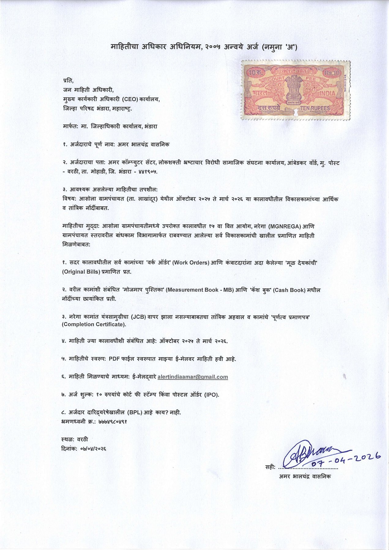 आसोला ग्रामपंचायतीमध्ये १५ व्या वित्त आयोगाच्या निधीत आणि नरेगा कामांत मोठ्या प्रमाणात अनियमितता झाल्याचा संशय व्यक्त करत, ‘पोलीस योद्धा न्यूज नेटवर्क’चे संपादक अमर वासनिक यांनी प्रशासकीय स्तरावर तक्रारींचा धडाका लावला आहे. दि. ०७ एप्रिल रोजी या प्रकरणाची सविस्तर माहिती ‘माहिती अधिकारात’ (RTI) मागवण्यात आली असून, याची प्रत थेट जिल्हाधिकारी, पोलीस अधीक्षक (SP) आणि BDO यांना पाठवण्यात आली आहे.