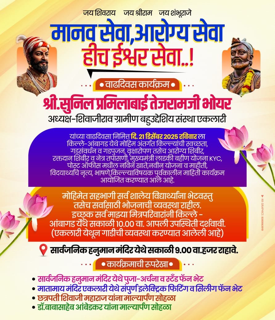 “मानव सेवा, आरोग्य सेवा हीच ईश्वर सेवा” या संदेशावर भर देत शिवाजी नगर, एकलारी येथील शिवाजीवेद ग्रामीण बहुउद्देशीय संस्थेचे अध्यक्ष श्री. सुनील प्रमिलाबाई तेजरामजी भोयर यांच्या वाढदिवसानिमित्त 21 व 23 डिसेंबरला सामाजिक मोहिमांचा मोठा उपक्रम हाती घेण्यात आला.