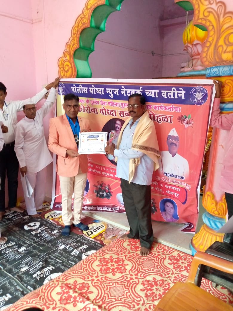 ओमकार श्री गुरुदेव सेवा पुरुष व महिला भजन मंडळ, गीत,गायन च्या माध्यमातून समाजाला जनजागृती करण्याचे उत्कृष्ट कार्य केल्याबद्दल *पोलीस योध्दा न्युज नेटवर्क*डायरेक्टर तथा मुख्य संपादक*राजकुमारजी खोब्रागडे यांनी महिला-पुरुष भजन मंडळाला *कोरोना योध्दा* प्रमाणपत्र देऊन सन्मानित केले.