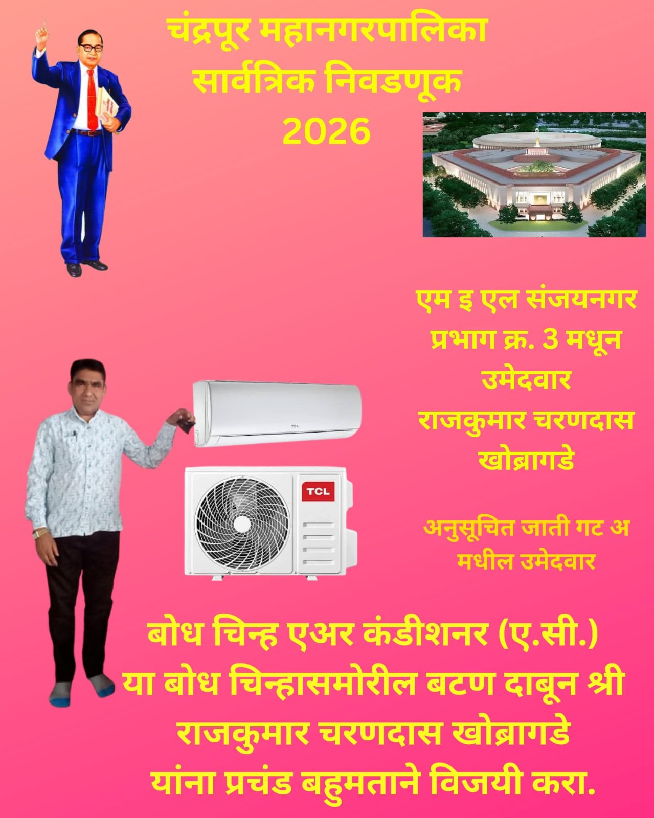 चंद्रपूर | प्रतिनिधी — चंद्रपूर महानगरपालिकेच्या सार्वत्रिक निवडणुकीच्या पार्श्वभूमीवर प्रभाग क्रमांक ३ (मधून) अनुसूचित जाती गटातून राजकुमार चरणदास खोब्रागडे यांनी निवडणूक रिंगणात दमदार प्रवेश केला आहे. एअर कंडिशनर (ए.सी.) हे निवडणूक चिन्ह घेऊन त्यांनी मतदारांसमोर मूलभूत सुविधा, दर्जेदार पायाभूत विकास आणि पारदर्शक कारभार असा ठोस विकास आराखडा मांडला आहे.