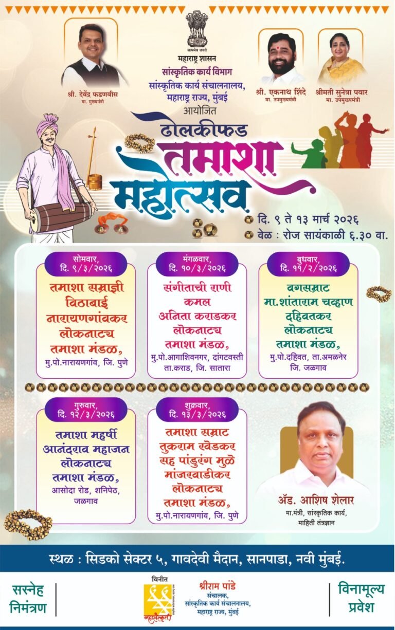 मुंबई, दि. ०६ : सांस्कृतिक कार्य संचालनालयामार्फत विविध प्रकारच्या कार्यक्रमांचे आयोजन करण्यात येते. याचाच एक भाग म्हणून ९ मार्च ते १३ मार्च, २०२६ या कालावधीत ढोलकीफड तमाशा महोत्सवाचे आयोजन करण्यात आले आहे.