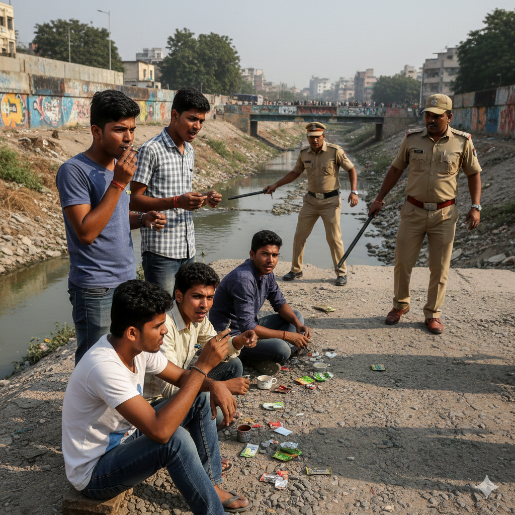नाल्याच्या बंधाऱ्यावर नशेचा अड्डा उघड – तरुणांच्या हातात गांजा, पोलिसांची अचानक कारवाई