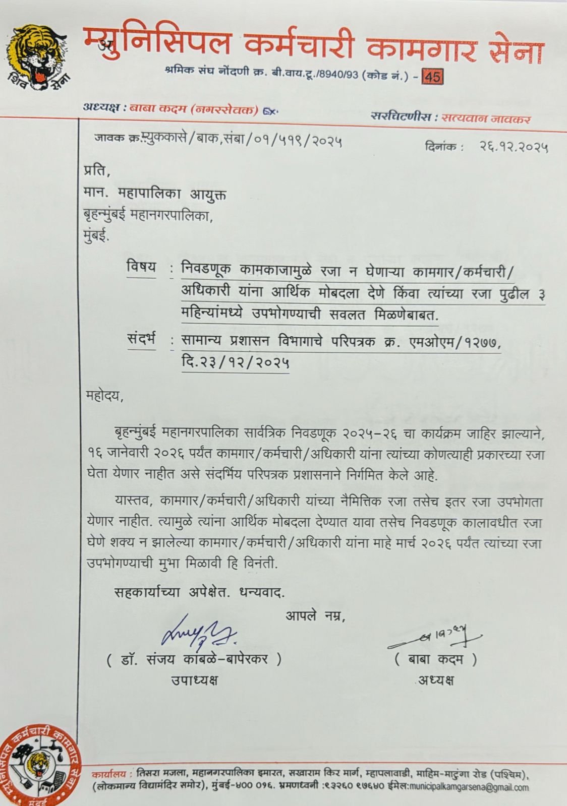 बृहन्मुंबई महानगरपालिकेच्या सार्वत्रिक निवडणुकीच्या पार्श्वभूमीवर कर्मचाऱ्यांना रजा न देण्याचा निर्णय प्रशासनाने घेतल्याने कर्मचाऱ्यांमध्ये तीव्र नाराजी व्यक्त होत आहे. या संदर्भात म्युनिसिपल कर्मचारी कामगार सेना संघटनेने महापालिका आयुक्तांना अधिकृत निवेदन पाठवून, रजा न मिळाल्याबद्दल कर्मचाऱ्यांना आर्थिक मोबदला देण्यात यावा किंवा निवडणुकीनंतर पुढील तीन महिन्यांत रजा उपभोगण्याची सवलत द्यावी, अशी ठाम मागणी केली आहे.