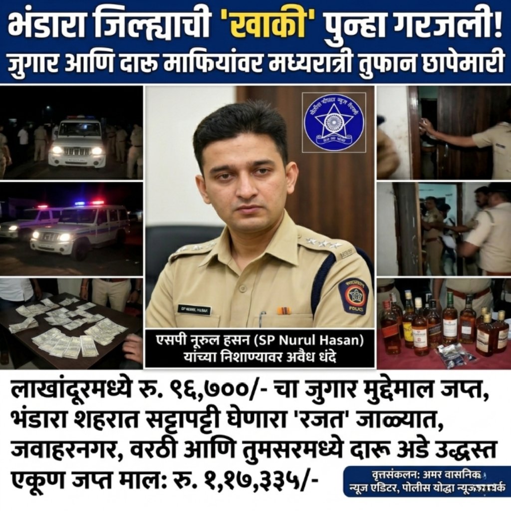 जिल्ह्यात अवैध व्यवसायांचे समूळ उच्चाटन करण्यासाठी भंडारा पोलीस अधीक्षक श्री. नूरुल हसन (SP Noorul Hasan) यांनी दिलेले आदेश आता गुन्हेगारांसाठी कर्दनकाळ ठरत आहेत. गेल्या २४ तासांत स्थानिक गुन्हे शाखा आणि विविध पोलीस ठाण्यांनी जिल्ह्याच्या कानाकोपऱ्यात धाडी टाकून जुगार आणि दारू अड्ड्यांवरून १ लाख १७ हजार ३३५ रुपयांचा मुद्देमाल जप्त केला आहे. या धडाकेबाज कारवाईमुळे जिल्ह्यातील अवैध धंदे करणाऱ्यांचे धाबे दणाणले आहेत.