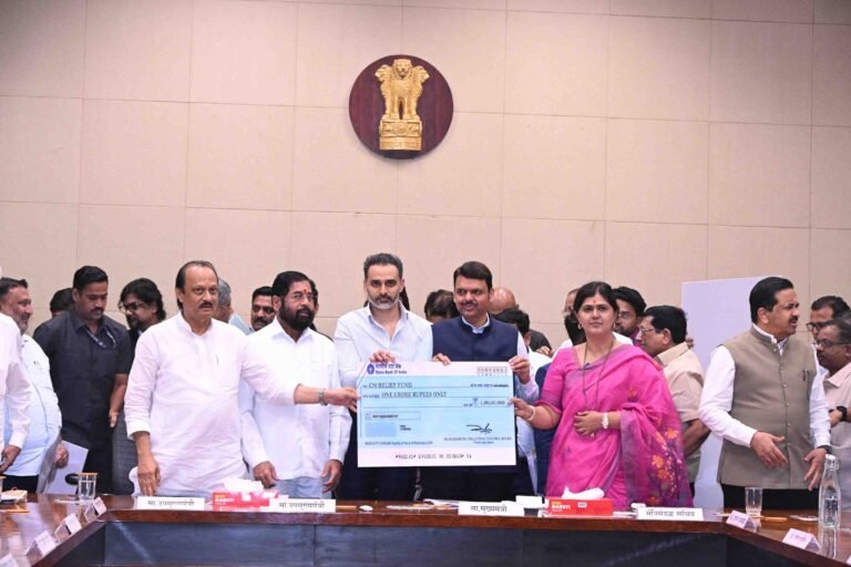 मुंबई, दि. ३०:  राज्यभरात अतिवृष्टीमुळे लाखो हेक्टर शेतीचे नुकसान झाले आहे. या परिस्थितीत शेतकरी बांधवाना मदत व्हावी, यासाठी महाराष्ट्र प्रदूषण नियंत्रण मंडळाकडून पूरग्रस्तांच्या मदतीसाठी एक कोटीचा धनादेश मुख्यमंत्री देवेंद्र फडणवीस यांना देण्यात आला. यावेळी उपमुख्यमंत्री एकनाथ शिंदे, उपमुख्यमंत्री अजित पवार, पर्यावरण व वातावरणीय बदल विभागाच्या मंत्री पंकजा मुंडे उपस्थित होत्या.