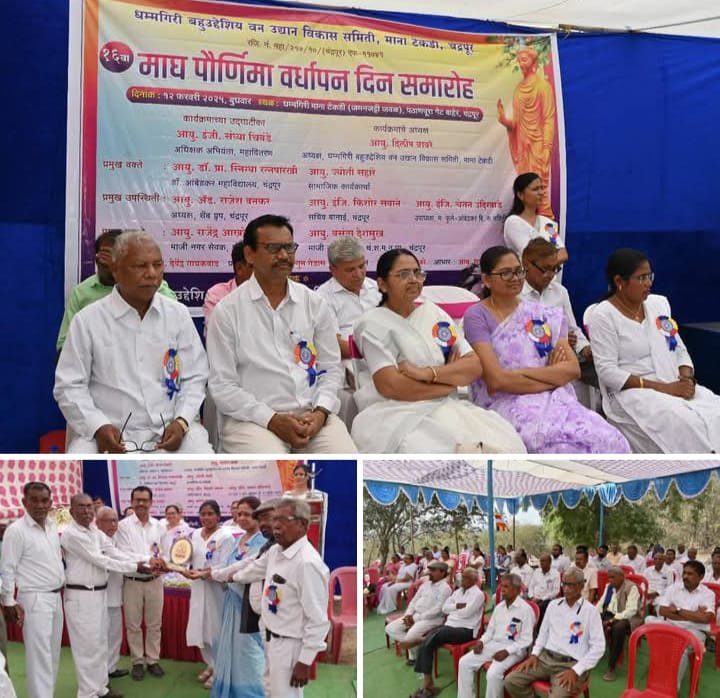धम्मगिरी बहुउद्देशिय वन उद्यान विकास समिती , मानाटेकडी ( जमणजेट्टी जवळ ), चंद्रपूर तर्फे आयोजित माघ पौर्णिमा समारोह आज दिनांक 12 फेब्रु. ला उत्साहात संपन्न झाला आहे. काही वर्षापूर्वी सदर मानाटेकडीवर संभावित सातवाहन काळातील अखंड दगडात कोरलेली बुद्धमूर्ती सापडली. त्याच्या पूर्वेला अगदी जवळच ‘ पंचगुफा ‘ म्हणून नोंद असलेले भिखू निवास सुद्धा आहे. यावरून मानाटेकडी हे तत्कालीन बुद्ध धम्माचे विज्जासन लेणीसारखे एक केंद्र नक्कीच राहिले असावे .परंतु भारत सरकार आणि पुरातत्व विभागाच्या हेतूपुरस्पर दुर्लक्षितपणामुळे हे स्थळ wcl च्या डम्पिंगखाली बऱ्यापैकी दाबल्या गेले आहे . परंतु काही वर्षांपूर्वी येथे बुद्धमूर्ती सापडल्याने या टेकडीवर या मूर्तीची प्रतिष्ठापणा करून माघ पौर्णिमेचा समारोह साजरा केल्या जात आहे . यासाठी चंद्रपूरातील काही बौद्ध अनुयायांनी पुढाकार घेऊन धम्मगिरी बहूउद्देशिय वन उद्यान विकास समिती ची स्थापना केली व या स्थळाला प्रकाशात आणले . मध्यंतरी काही काळ येथे समारोहाच्या आयोजनात खंड पडला होता , परंतु मान. दिलीपजी वावरे यांचेसारख्या कर्तव्यदक्ष व्यक्तीकडे या समितीचे अध्यक्षपद सोपवून समितीने या परिसराचा विकास घडवून आणण्याचा चंग बांधला आहे .