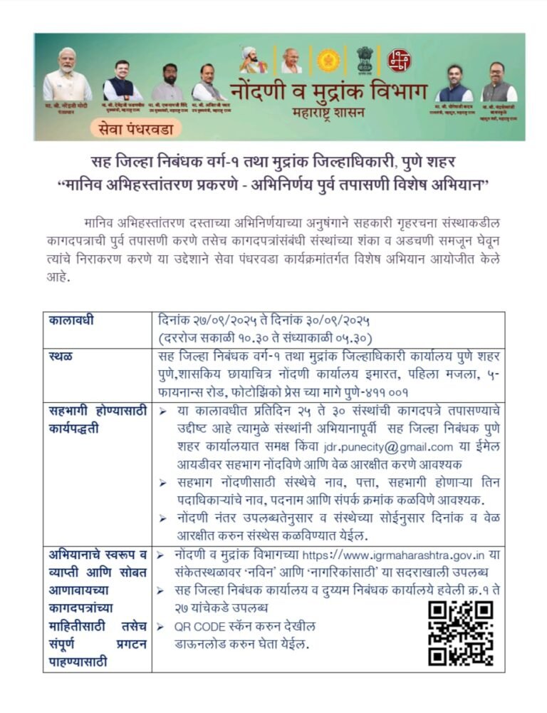 मुंबई, दि. २७ : मानीव अभिहस्तांतरण दस्ताच्या अभिनिर्णयाच्या अनुषंगाने सहकारी गृहरचना संस्थांकडील कागदपत्रांची पूर्व तपासणी तसेच कागदपत्रांसंबंधी संस्थांच्या शंका व अडचणी समजून घेऊन त्यांचे निराकरण केले जात आहे. या अनुषंगाने महसूल विभागाच्या सेवा पंधरवडा कार्यक्रमांतर्गत सह जिल्हा निबंधक वर्ग-१ तथा मुद्रांक जिल्हाधिकारी कार्यालय, पुणे शहर या कार्यालयामार्फत २७ ते ३० सप्टेंबर २०२५ या कालावधीत विशेष अभियान आयोजित करण्यात आले असून अभिनिर्णय प्रक्रिया अधिक पारदर्शक व जलद गतीने पूर्ण करण्यासाठी हे अभियान महत्त्वपूर्ण ठरणार आहे. याचा सहकारी गृहरचना संस्थांनी लाभ घ्यावा, असे आवाहन करण्यात आले आहे.