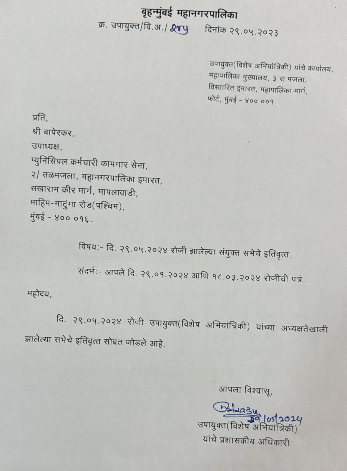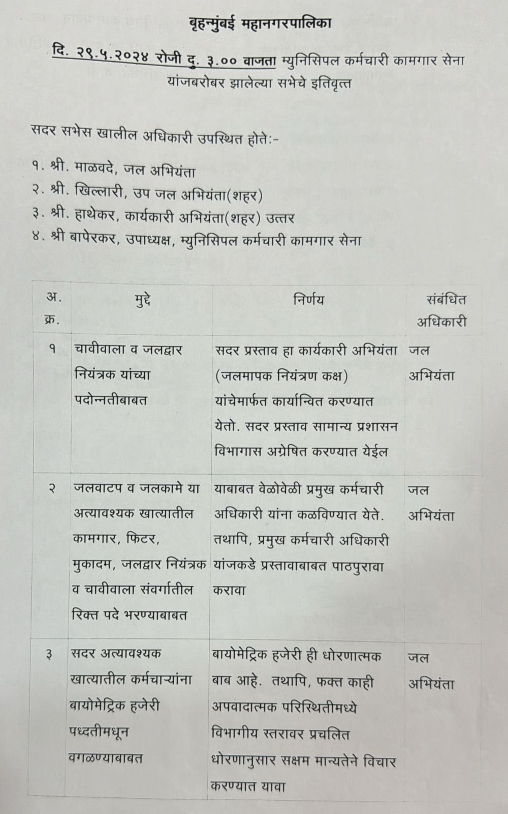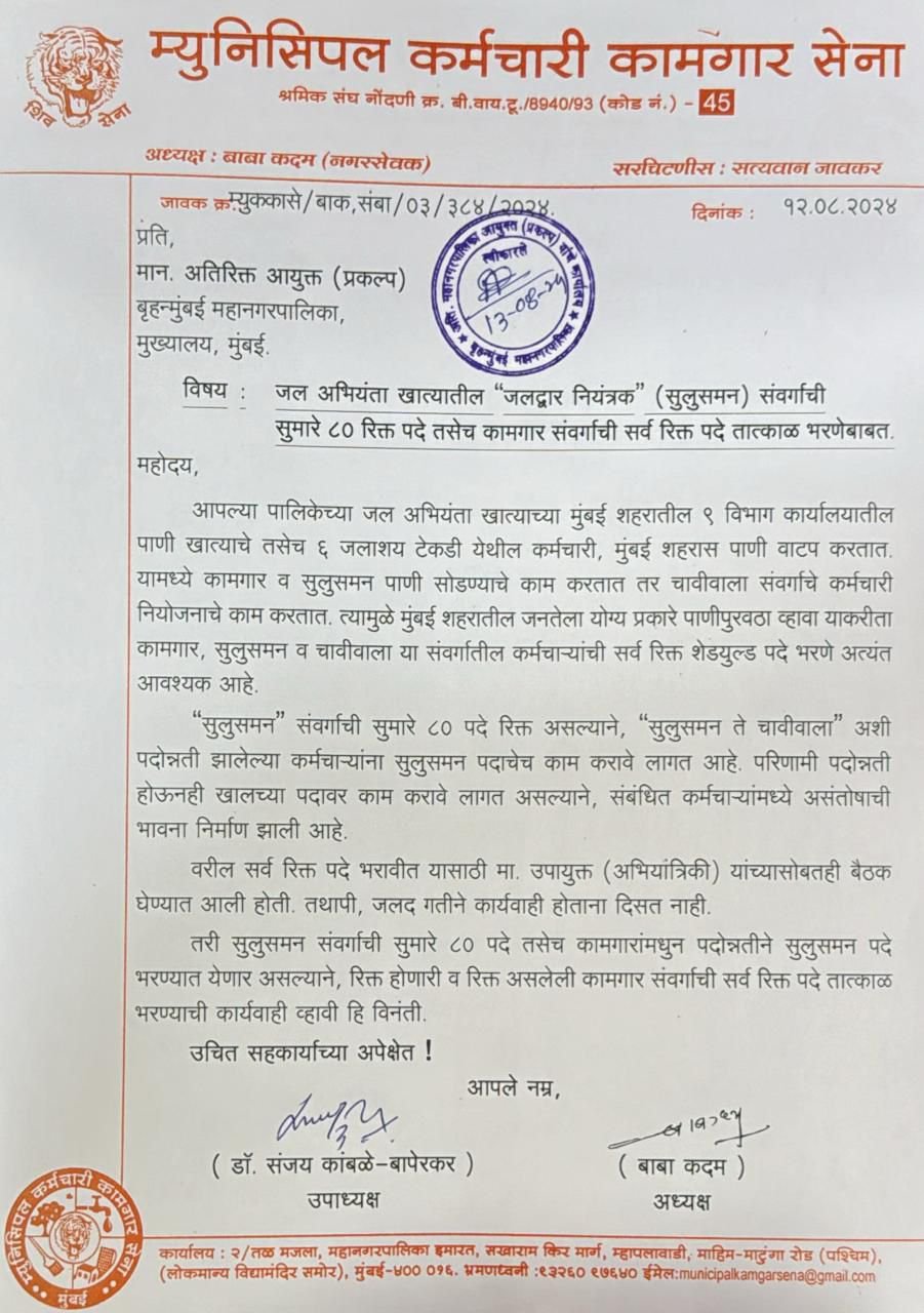 मुंबईकर जनतेला पाणी वाटप सुरळीतपणे होण्यासाठी सर्व रिक्त पदे भरा- कामगार सेनेची मागणी