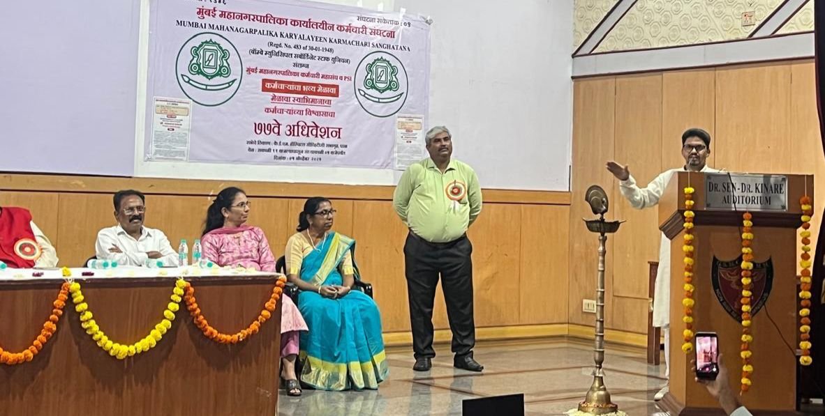 मुंबई : मुंबई महानगरपालिकेच्या के.ई.एम. रुग्णालयातील CVTC सभागृहात मुंबई महानगरपालिका कार्यालयीन कर्मचारी संघटनेचे ७७वे अधिवेशन मोठ्या उत्साहात पार पडले. या अधिवेशनाला विविध विभागातील अधिकारी, कर्मचारी, तसेच कामगार संघटनांचे पदाधिकारी उपस्थित होते.