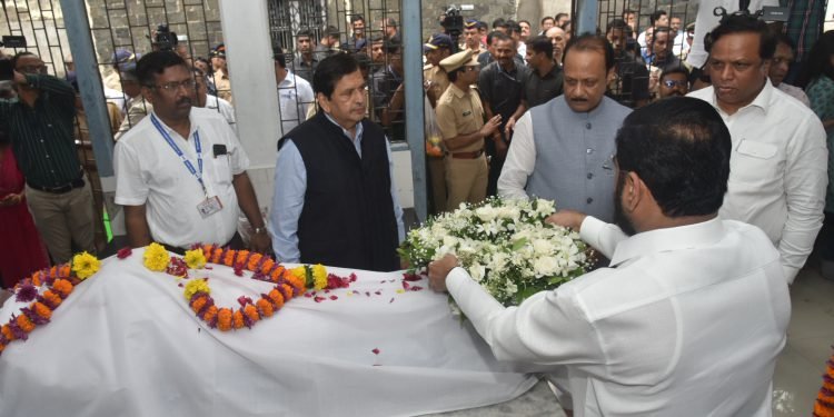 मुंबई, दि. ४ : मुख्यमंत्री एकनाथ शिंदे आणि उपमुख्यमंत्री अजित पवार यांनी आज सकाळी जे.जे. रुग्णालय येथे ख्यातनाम कला दिग्दर्शक नितीन देसाई यांच्या पार्थिवावर पुष्पचक्र अर्पण केले आणि त्यांचे अंत्यदर्शन घेऊन भावपूर्ण श्रद्धांजली वाहिली.