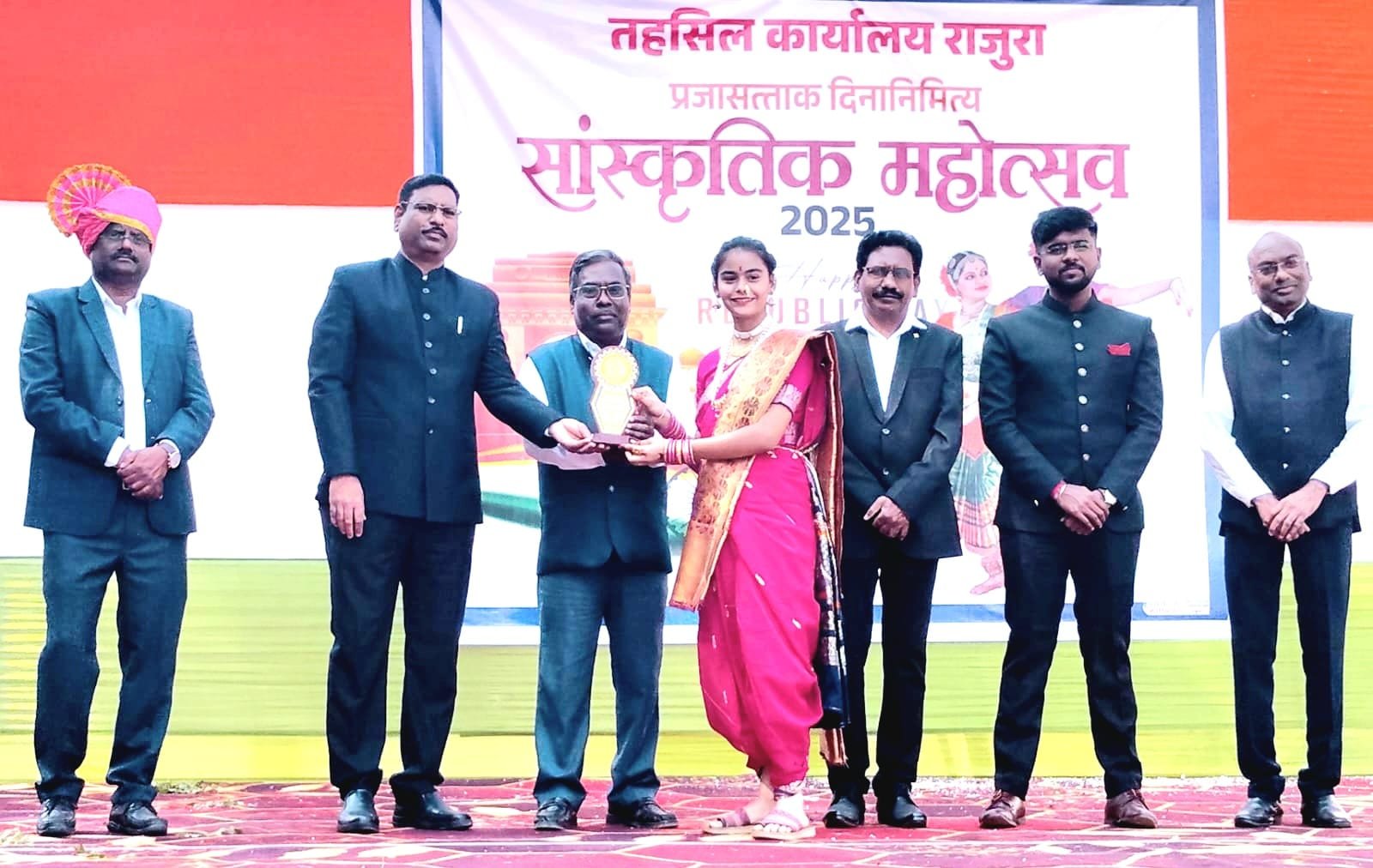 राजुरा तहसील कार्यालय येथे गणराज्य दिनानिमित्त दि. २६/०१/२०२५ ला आयोजित सास्कृतिक महत्सोवात सुनिल रामटेके ह्यांची कन्या कु.तन्वी रामटेके,हिच्या उत्कृष्ट वेशभूषा, कराटे ब्लॅक बेल्ट पुणे येथे झालेल्या ओकिनाका आर्ट व कराटे शोटोकाई इंडिया या संस्थेमार्फत आयोजित नॅशनल चॅम्पियन पुरस्कार प्राप्त करून राजुराचे नाव राज्यस्तरावर नावलौकीक केल्याबद्दल प्रसिद्ध मनोवैज्ञानिक ॲड.डॉ. सत्यपाल कातकर,माजी प्राचार्य तथा लेखक व मा.रविंद्र माने, उपविभागीय अधिकारी, राजुरा, ह्यांच्या हस्ते व साईकिरण आऊलवार, नायब तहसीलदार , प्रवीण गावंडे,नायब तहसीलदार, शेखर तेलंग,नायब तहसीलदार व श्री मनोज गौरकार,गटविकास अधिकारी ह्यांच्या उपास्थित पुरस्कार प्रदान करण्यात आला, तिच्या या यशाबद्दल शहरातील सुज्ञ नागरिक कु. तन्वी व तिच्या माता पित्याचे अभिनंदन करीत आहेत