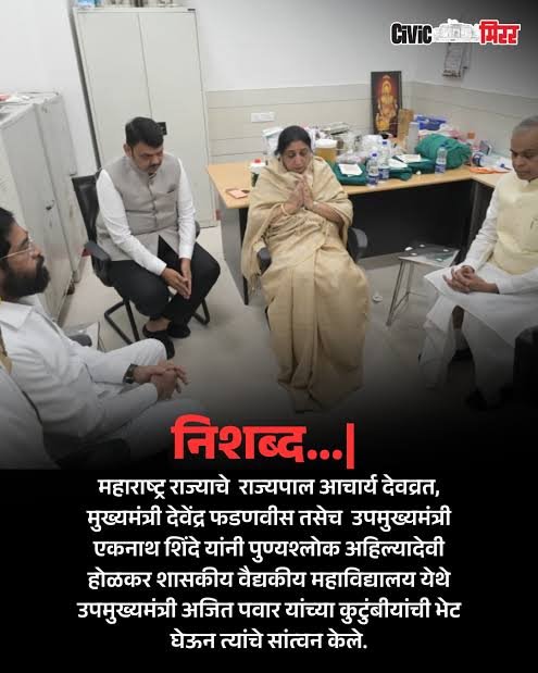 बारामती दि. २८: राज्यपाल आचार्य देवव्रत यांच्यासह मुख्यमंत्री देवेंद्र फडणवीस आणि उपमुख्यमंत्री एकनाथ शिंदे यांनी विद्या प्रतिष्ठानच्या मुख्य इमारत येथे ज्येष्ठ नेते खासदार शरद पवार, खासदार सुनेत्रा पवार, खासदार सुप्रिया सुळे यांची भेट घेऊन सांत्वन केले.