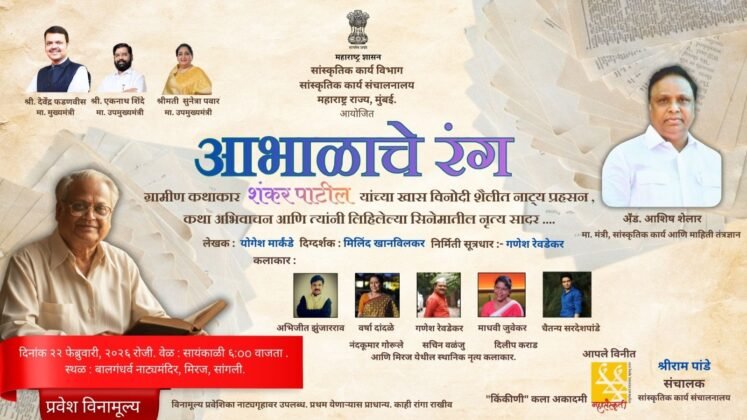 मुंबई, दि. १८ : सांस्कृतिक कार्य विभाग आणि सांस्कृतिक कार्य संचालनालय यांच्या वतीने सुप्रसिद्ध ग्रामीण कथाकार शंकर पाटील यांच्या साहित्यावर आधारित ‘आभाळाचे रंग’ या विशेष कार्यक्रमाचे आयोजन करण्यात आले आहे. हा कार्यक्रम रविवार, दि. २२ फेब्रुवारी, २०२६ रोजी सायंकाळी ६:०० वाजता मिरज येथील बालगंधर्व नाट्यमंदिर येथे होणार आहे.