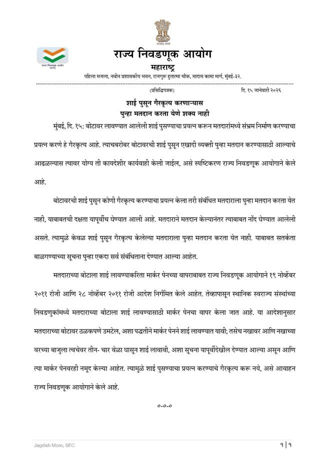 बृहन्मुंबई महानगरपालिका सार्वत्रिक निवडणूक-2026 साठी मतदान केल्यानंतर बोटावरील शाई पुसली जात असल्याचे वृत्त विविध माध्यमांतून प्रसारित होत आहे. महानगरपालिका आयुक्त यांनी ही बाब मान्य केल्याचेही या वृत्तात सांगितले जात आहे.
