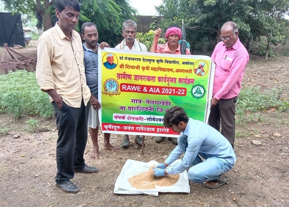 पारशिवनी तालुक्यातील तेलंनखेडी गावातील शेतकरी लोमेश्वर परसरामजी गडे यांच्या शेतात डॉ पंजाबराव देशमुख कृषि विद्यापिठ अकोला व्दारे श्री शिवाजी कृषि महाविद्यालय, अमरावती अंतर्गत ७ वे सत्र कृषिदुत जयंत राधेश्याम हारोडे हयानी ग्रामिण कृषी जनजागरण कार्यानुभव कार्यक्रमांतर्गत शेतक-याच्या शेतात बीज प्रक्रिया चे महत्व आणि विविध प्रयोगाचे प्रात्याक्षिक करून दाखवुन या प्रक्रिया केल्या ने उत्पन्नात होणारी वाढ, किटका व्दारे पिकाची सुरक्षा तसेच ट्रायकोडर्मा व पीएसबी विषयी शेतकयांना मार्ग दर्शन करण्यात आले. याप्रसंगी लोमेश्वर परसरामजी गडे, बाबुलाल हिवसे, नरेंद्र खिळेकर, नरेंद्र गडे, धनिरा म मोहोड सह शेतकरी प्रामुख्याने उपस्थित होते.