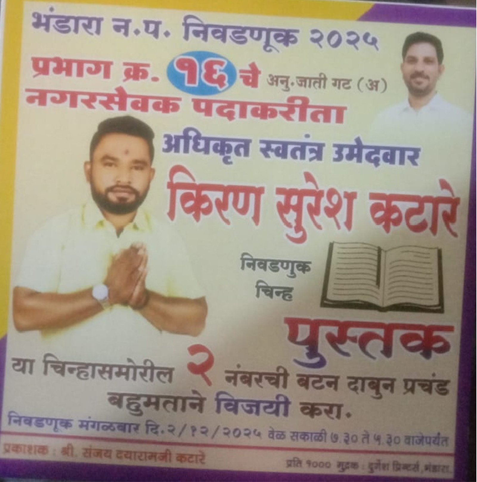 ЁЯОм рднрдВрдбрд╛рд░рд╛ рдирдЧрд░ рдкрд░рд┐рд╖рдж рдирд┐рд╡рдбрдгреВрдХ 2025 : рдкреНрд░рднрд╛рдЧ рдХреНрд░рдорд╛рдВрдХ резрем рдордзреВрди рдХрд┐рд░рдг рд╕реБрд░реЗрд╢ рдХрдЯрд╛рд░реЗ рдпрд╛рдВрдЪреЗ рдирд╛рдорд╛рдВрдХрди, рдкрд╛рдЪ рд╡рд░реНрд╖рд╛рдВрдЪреНрдпрд╛ рд╕рд╛рдорд╛рдЬрд┐рдХ рдХрд╛рд░реНрдпрд╛рдЪрд╛ рдЕрдиреБрднрд╡ рдард│рдХ