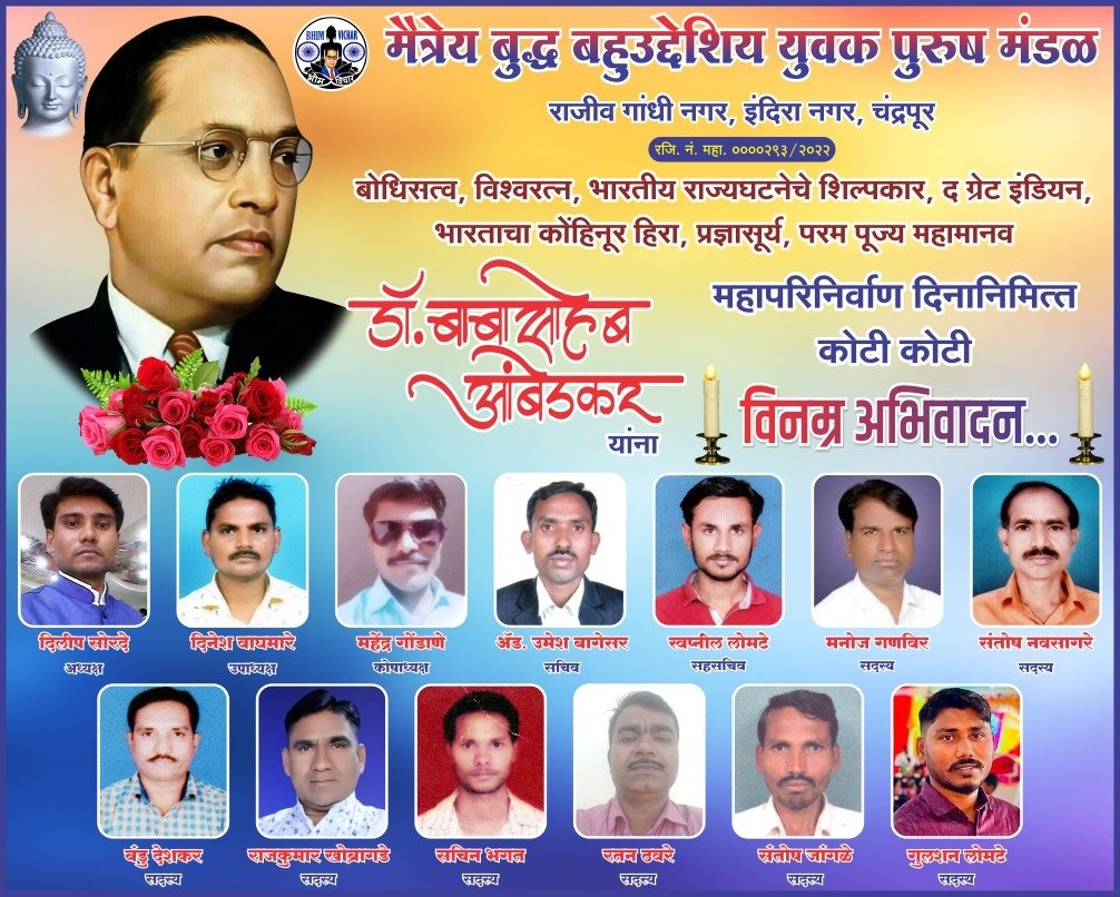 рднрд╛рд░рддреАрдп рд░рд╛рдЬреНрдпрдШрдЯрдиреЗрдЪреЗ рд╢рд┐рд▓реНрдкрдХрд╛рд░, рдмреЛрдзрд┐рд╕рддреНрд╡, рд╡рд┐рд╢реНрд╡рд░рддреНрди, рдкреНрд░рдЬреНрдЮрд╛рд╕реВрд░реНрдп, рдХреЛрд╣рд┐рдиреВрд░ рд╣рд┐рд░реЗ рдЖрдгрд┐ рдкрд░рдо рдкреВрдЬреНрдп рдорд╣рд╛рдкреБрд░реБрд╖ рдбреЙ. рдмрд╛рдмрд╛рд╕рд╛рд╣реЗрдм рдЖрдВрдмреЗрдбрдХрд░ рдпрд╛рдВрдЪреНрдпрд╛ рдорд╣рд╛рдкрд░рд┐рдирд┐рд░реНрд╡рд╛рдг рджрд┐рдирд╛рдирд┐рдорд┐рддреНрдд рдореИрддреНрд░реЗрдп рдмреБрджреНрдз рдмрд╣реБрдЙрджреНрджреЗрд╢реАрдп рдпреБрд╡рдХ рдкреБрд░реБрд╖ рдордВрдбрд│, рд░рд╛рдЬреАрд╡ рдЧрд╛рдВрдзреА рдирдЧрд░ тАУ рдЗрдВрджрд┐рд░рд╛ рдирдЧрд░, рдЪрдВрджреНрд░рдкреВрд░рддрд░реНрдлреЗ рднрд╛рд╡рдкреВрд░реНрдг рд╢реНрд░рджреНрдзрд╛рдВрдЬрд▓реА рдЕрд░реНрдкрдг рдХрд░рдгреНрдпрд╛рдд рдЖрд▓реА.