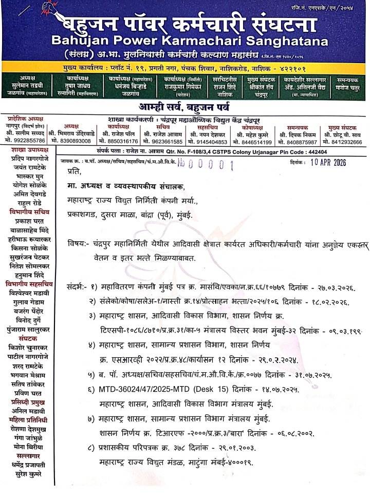 संघटनेने सादर केलेल्या पत्रात स्पष्ट करण्यात आले आहे की, चंद्रपूर जिल्ह्यातील दुर्गापूर आणि ऊर्जानगर हे भाग आदिवासी बहुल क्षेत्रात येतात. महावितरणने यापूर्वीच आपल्या कर्मचाऱ्यांसाठी हे भत्ते लागू करण्याचे आदेश दिले आहेत, मग एकाच होल्डिंग कंपनीच्या छत्राखाली असलेल्या महानिर्मितीमध्ये हा दुजाभाव का? या प्रश्नासह संघटनेचे केंद्रीय समन्वयक आयु. मनोज चतुर, मुख्य संघटक श्रीकांत रॉय आणि शाखा सचिव राजेश आत्राम यांनी पुराव्यांची मोठी शिदोरीच प्रशासनासमोर मांडली आहे.