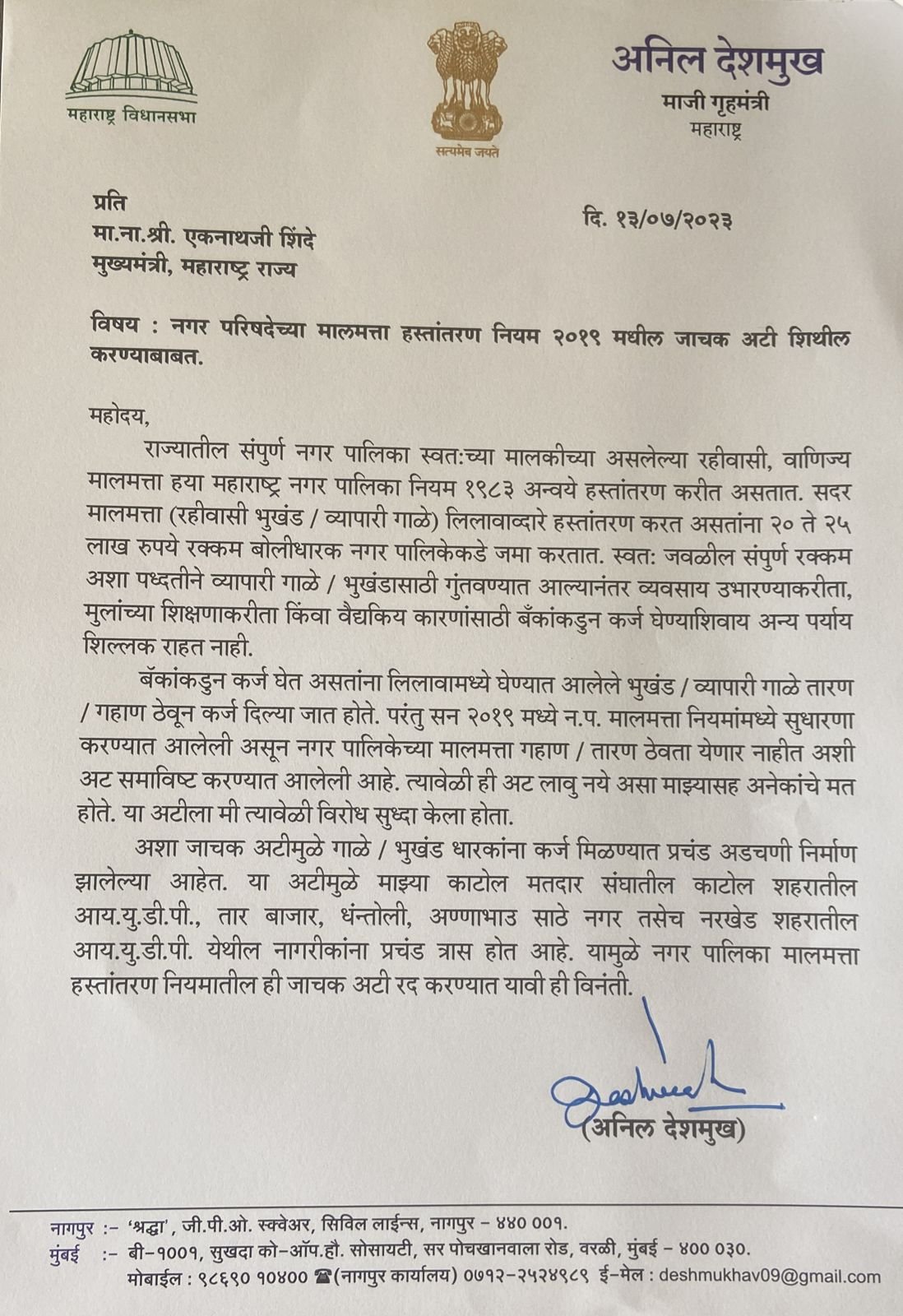 दरम्यान अधिवेशन सुरु होण्याच्या पुर्वीच अनिल देशमुख यांनी मुख्यमंत्री एकनाथ शिंदे यांना पत्र लिहुन सदर लिहुन लिजधारकांना कर्ज घेण्याची मुभा देण्याची मागणी केली होती. त्याठी 2019 च्या कायद्यात बदल करण्याची मागणी अनिल देशमुख यांनी या पत्राच्या माध्यमातुन मुख्यमंत्री शिंदे यांच्या केली होती. जो पर्यत या कायद्यात दुरुस्ती होत नाही तो पर्यत आपला हा लढा सुरुच राहणार असल्याचे मत अनिल देशमुख यांनी व्यक्त केले.
